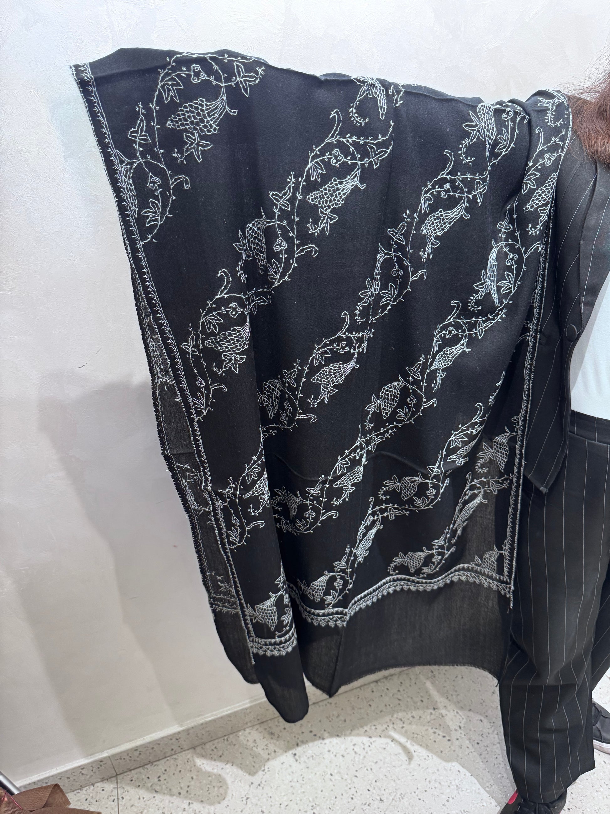 Pashmina Extra Fine Wool Shawl, Tone On Tone Palla Embroidery Design, Black